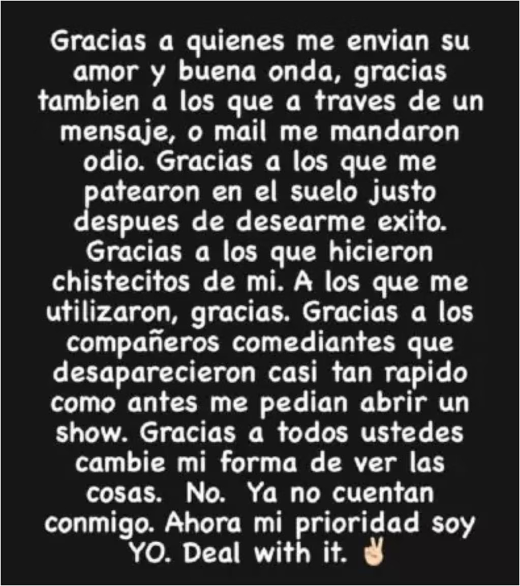 También "agradeció" a "los compañeros comediantes que desaparecieron casi tan rápido como antes me pedían abrir un show".
