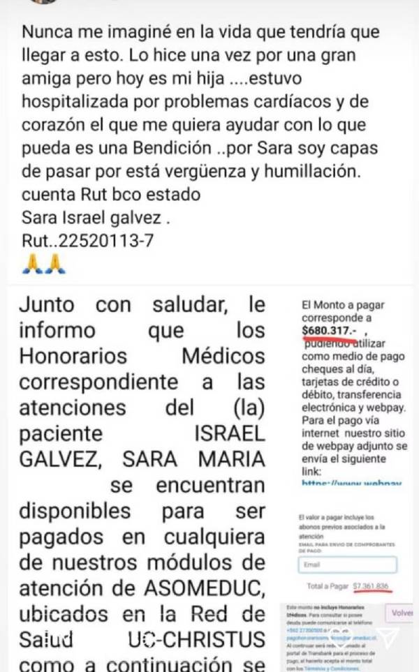 "Estuvo hospitalizada por problemas cardíacos, y de corazón el que me quiera ayudar con lo que pueda es una bendición. Por Sara soy capaz de pasar por esta vergüenza y humillación", agregó la mujer junto con compartir documentos de la hospitalización y datos para transferencia.