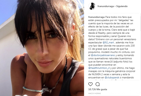 En su cuenta de Instagram, explicó los motivos de las imágenes donde luce flaca. "Para todos mis fans que están preocupados por mi “delgadez” les cuento que la mayoría de las veces es un efecto de las luces, de la posición del cuerpo y de la toma. Claro está que si bajé desde el Reality, pero siempre de una forma responsable y sana!", señaló, contando que además que se hizo una lipo láser.