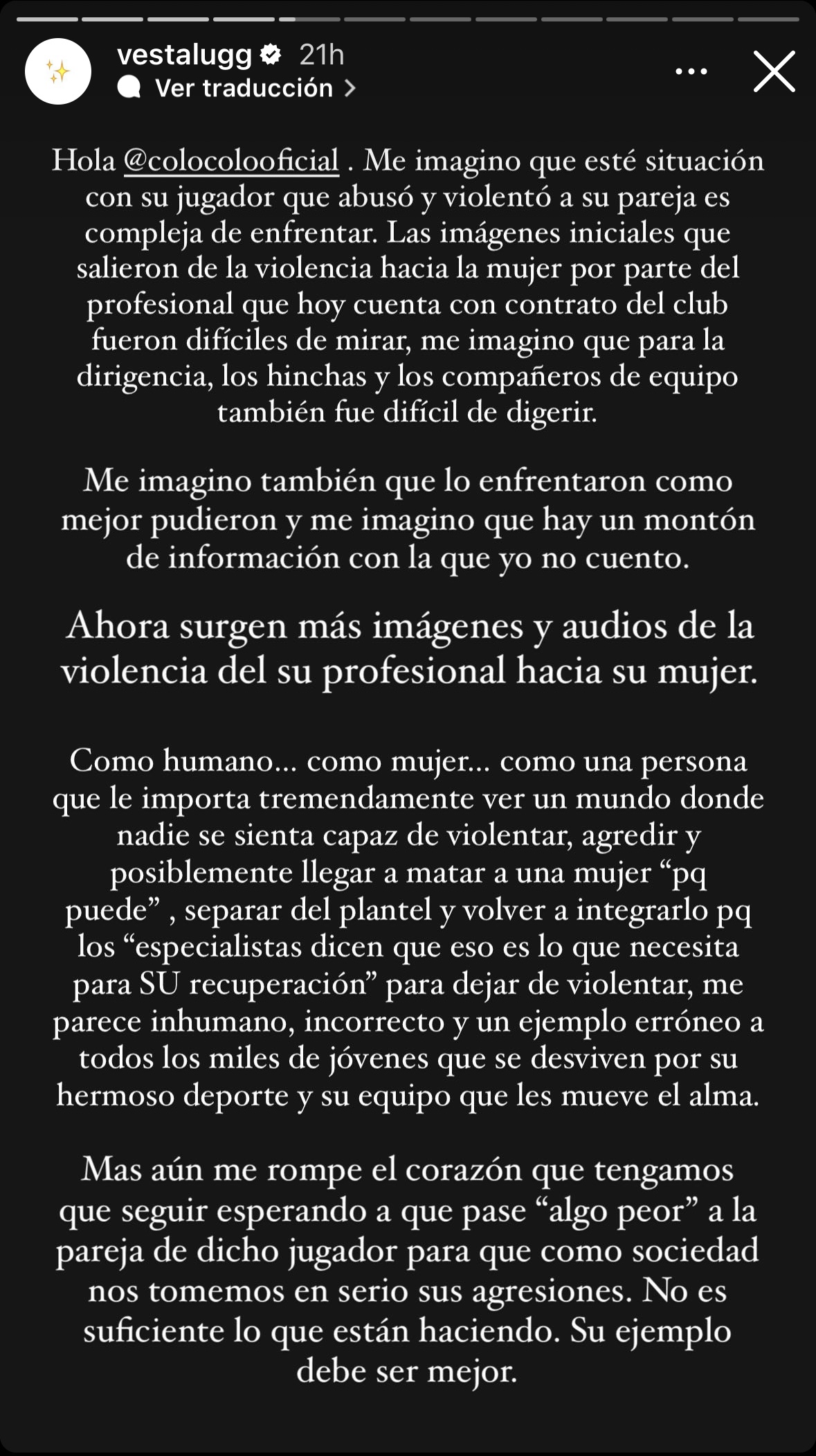 "Ahora surgen más imágenes y audios de la violencia de su profesional hacia su mujer. Como humano... como mujer... como una persona que le importa tremendamente ver un mundo donde nadie se sienta capaz de violentar, agredir y posiblemente llegar a matar a una mujer "pq puede" , separar del plantel y volver a integrarlo pa los 'especialistas dicen que eso es lo que necesita para SU recuperación' para dejar de violentar, me parece inhumano, incorrecto y un ejemplo erróneo a todos los miles de jóvenes que se desviven por su hermoso deporte y su equipo que les mueve el alma", señaló la también influencer, agregando que lamenta "que tengamos que seguir esperando a que pase 'algo peor'" a la víctima para tomar en serio el caso.