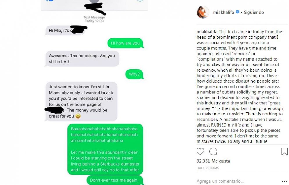 - Hola Mia, soy [] - Hola, ¿cómo estás? - Genial. Gracias por preguntar, ¿Sigues en Los Angeles? - ¿Por qué? - Solo quería saber. Yo sigo en Miami obviamente. Te quería preguntar si estás interesada en hacer shows de webcam para nosotros en []. El dinero puede ser muy bueno para ti. - Jajajajajajajajajajajajajajaja, déjame que esto quedé abundantemente claro: podría estar muriendo de hambre, viviendo en la calle, y aún así le diría no a esa oferta. Nunca más me escribas.