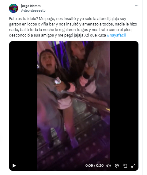 "Me pegó, nos insultó y yo solo la atendí jajaja soy garzón en 'Locos x Viña Bar' y nos insultó y amenazo a todos, nadie le hizo nada, bailó toda la noche le regalaron tragos y nos trato como el p... desconoció a sus amigos y me pegó", escribió en su cuenta de X (anteriormente Twitter).