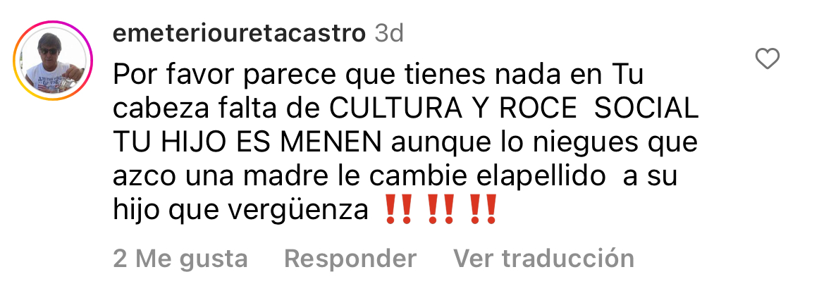 "Por favor parece que tienes nada en Tu cabeza falta de CULTURA Y ROCE SOCIAL TU HIJO ES MENEM, aunque lo niegues que asco una madre le cambie el apellido a su hijo, que vergüenza", lanzó sin filtro el padre de Tita Ureta.