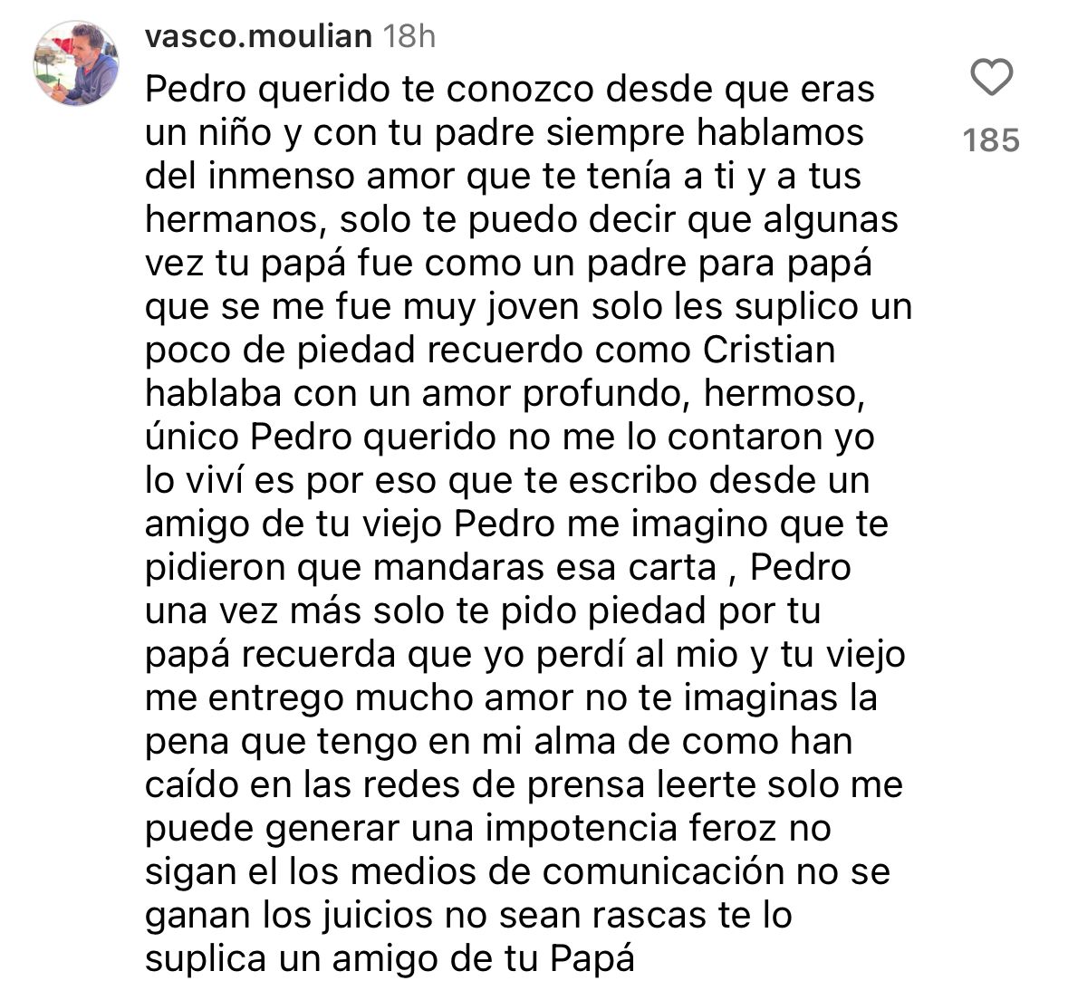 Luego de que Pedro Campos apoyara públicamente a su hermana Raffaella di Girolamo en la querella por abuso sexual contra Cristián Campos, padre del intérprete de "Amar Profundo", Vasco Moulian envió un mensaje al actor.