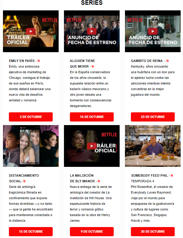 El 23 de octubre se estrenará "Gambito de reina" con Anya Taylor-Joy, el 9 la serie de terror "La maldición de Bly Manor" y el 2 de octubre la comedia romántica de Lily Collins "Emily en París".