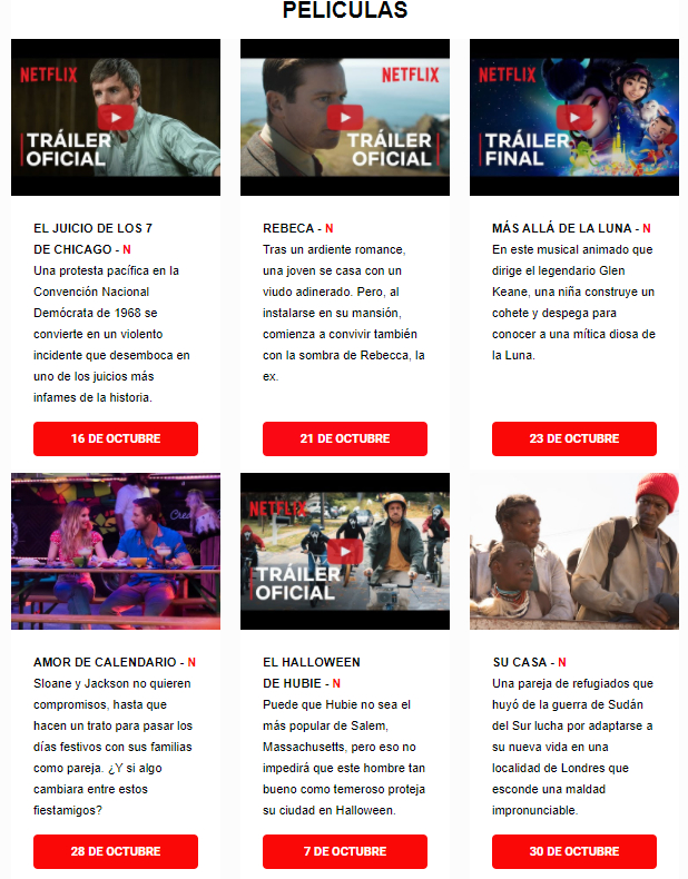 Netflix dio a conocer el listado de series y películas que estrenará en octubre, mes que estará marcado por las producciones originales de la compañía.