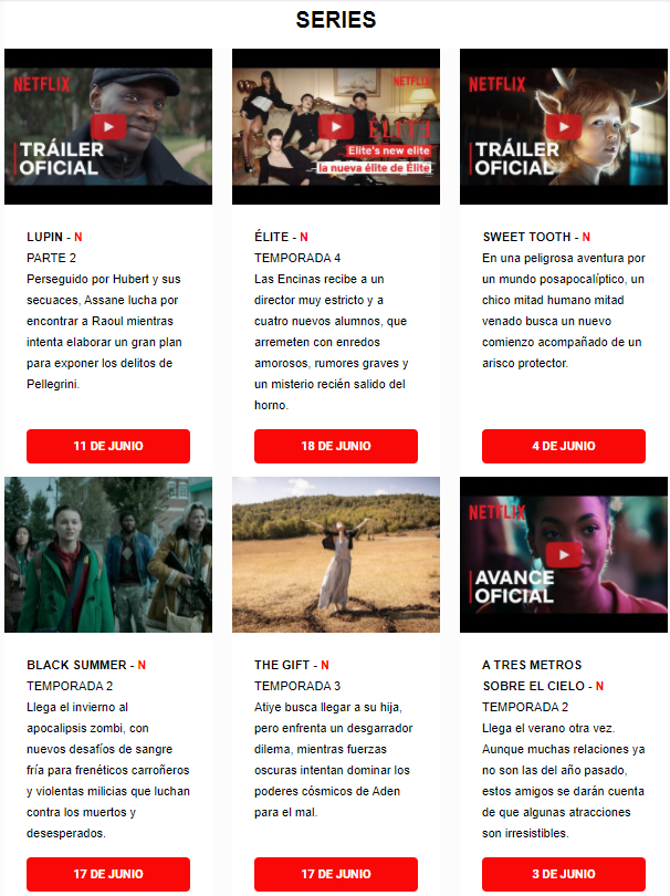 Una de las series más populares en retornar el próximo mes es la francesa "Lupin" que estrenará su segunda temporada el 11 de junio. Por su parte la española "Élite" debutará con su cuarta temporada el 18 de junio, mientras que el 16 lanzarán una mini serie enfocada en algunos personajes del colegio Las Encinas.