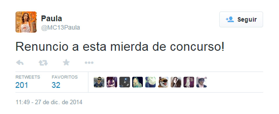 Paula no dio detalles de su decisión, pero fue enfática en señalar que "Renuncio a esta mierda de concurso" (sic).