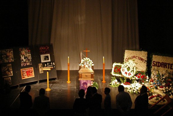 El fallecido actor César Arredondo es despedido por su familia, encabezada por su esposa Gabriela Medina, y sus amigos y colegas actores. Su féretro es retirado del velorio en el Teatro Sidarte para realizar su funeral en el cementerio Parque del Sendero.