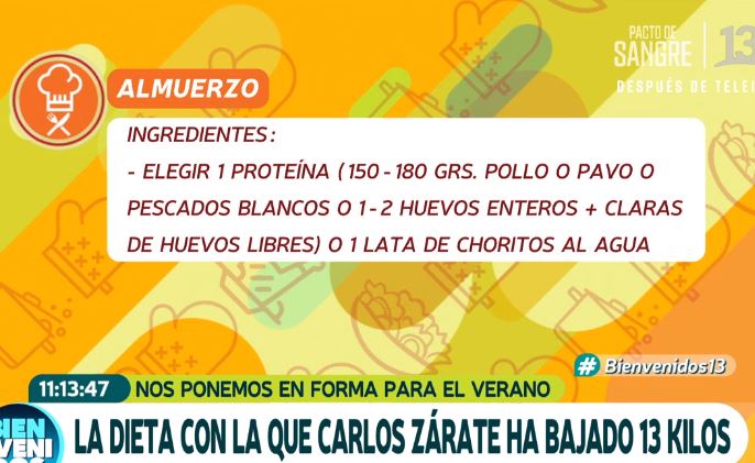 El periodista Carlos Zárate, de Canal 13, siguió una estricta dieta que lo hizo perder 18 kilos. "Cambia la percepción de las personas, cuando pesaba 160 kilos y ahora", dijo Zárate, de 58 años, quien dijo que le había salido más pelo con su nueva alimentación. Su edad "metabólica" es de 73 años, que es cómo el cuerpo se siente. Revisa sus opciones de platillo.