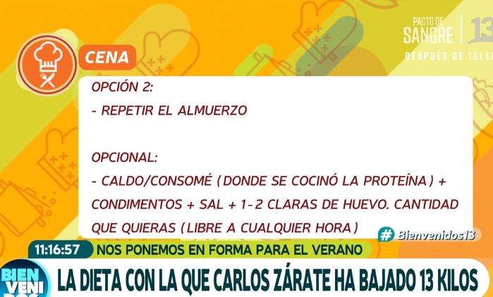 El periodista Carlos Zárate, de Canal 13, siguió una estricta dieta que lo hizo perder 18 kilos. "Cambia la percepción de las personas, cuando pesaba 160 kilos y ahora", dijo Zárate, de 58 años, quien dijo que le había salido más pelo con su nueva alimentación. Su edad "metabólica" es de 73 años, que es cómo el cuerpo se siente. Revisa sus opciones de platillo.