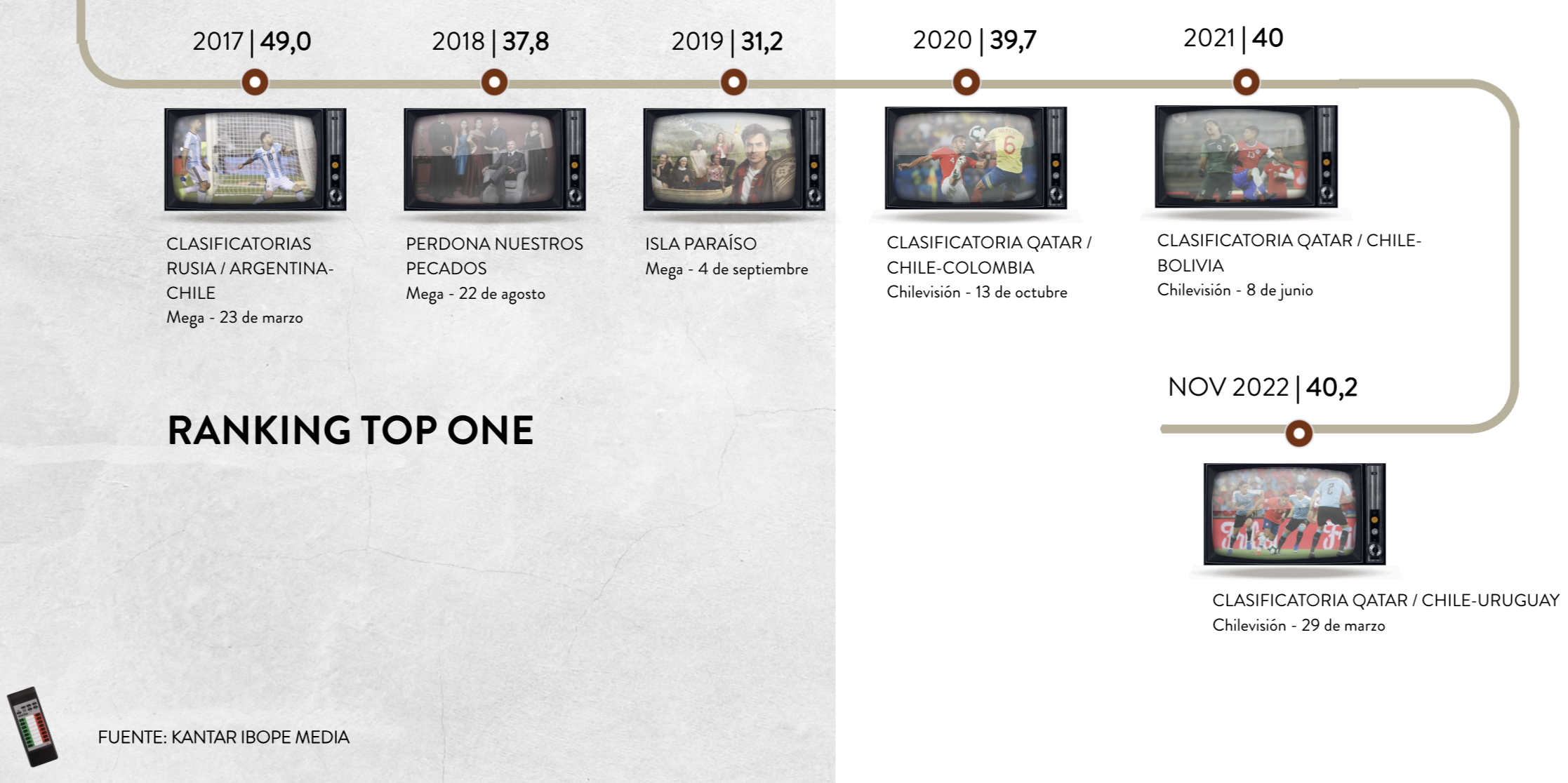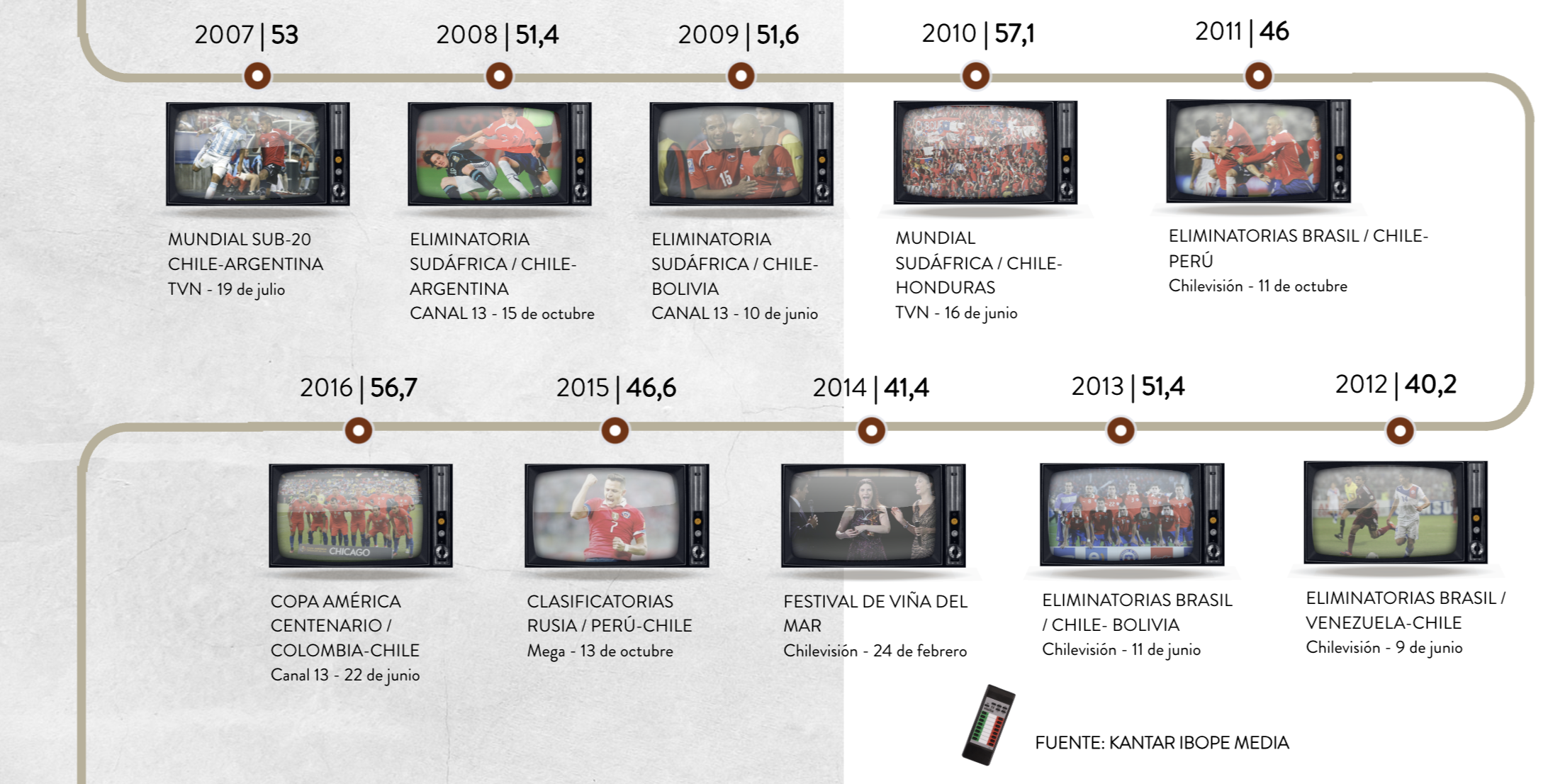 Los programas más vistos del ránking fueron el encuentro de Chile y Honduras en el Mundial de Fútbol de Sudáfrica en 2010 (57,10); el partido entre Colombia y Chile en la Copa Centenario de 2016 (56,70) y un Chile-Ecuador en las eliminatorias rumbo al Mundial de 2006 (55,60).