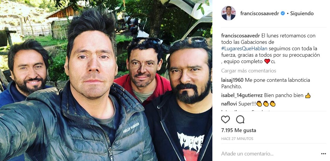Luego de la suspensión de las grabaciones de "Lugares que hablan", por la crisis que vive Canal 13, Pancho Saavedra salió a calmar a los muchos seguidores del programa: "El lunes retomamos con todo las grabaciones de #LugaresQueHablan seguimos con toda la fuerza, gracias a todos por su preocupación, equipo completo".