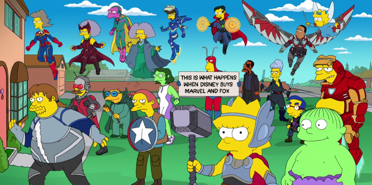 De vuelta en la tierra "Lisa" invita a una especial versión de los "Avengers" personificados por distintos ciudadanos de "Springfield", junto a un cartel que dice "esto es lo que pasa cuando Disney compra Marvel y Fox".