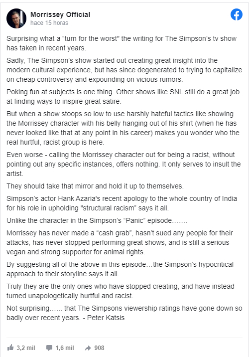 "A diferencia del personaje de este episodio, Morrissey jamás ha trabajado solo 'para hacer caja', ni ha demandado a nadie por sus ataques, ni ha dejado de dar excelentes shows y sigue siendo un vegano serio y un férreo defensor de los derechos animales", agregó el cantante, desmarcándose de la caricatura.