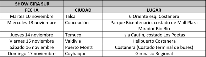 Tras haber finalizado su tramo norte con un show en La Serena, la Gira Teletón se trasladará al sur del país. Talca, Concepción, Temuco, Valdivia, Puero Montt y Coyhaique son las ciudades que recorrerá el tramo sur de la caravana solidaria y que también tendrá espectáculos intermedios en Curicó, Chillán, San José de la Mariquina y Osorno.