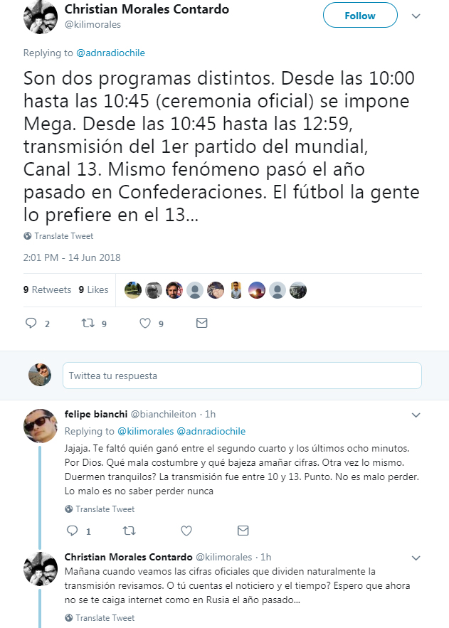 Una intensa pelea tuitera entre los periodistas Felipe Bianchi y Christián Morales se desató en Twitter a propósito del rating por el partido inaugural del Mundial de Rusia 2018.