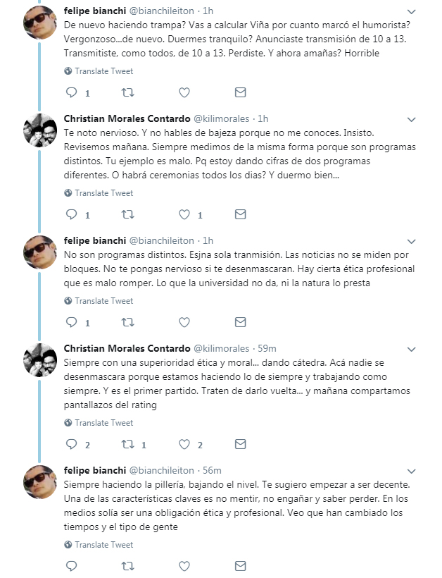 Por su parte Morales replicó "espero que ahora no se te caiga internet como en Rusia el año pasado" y Bianchi respondió "no te pongas nervioso si te desenmascaran. Hay cierta ética profesional que es malo romper. Lo que la universidad no da, ni la natura lo presta".