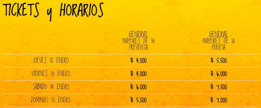 Los precios de las entradas dependen de la jornada y van desde los $4.000 a los $7.500 y se pueden adquirir en sistema Ticketek. Los menores de 14 años ingresan gratis.
