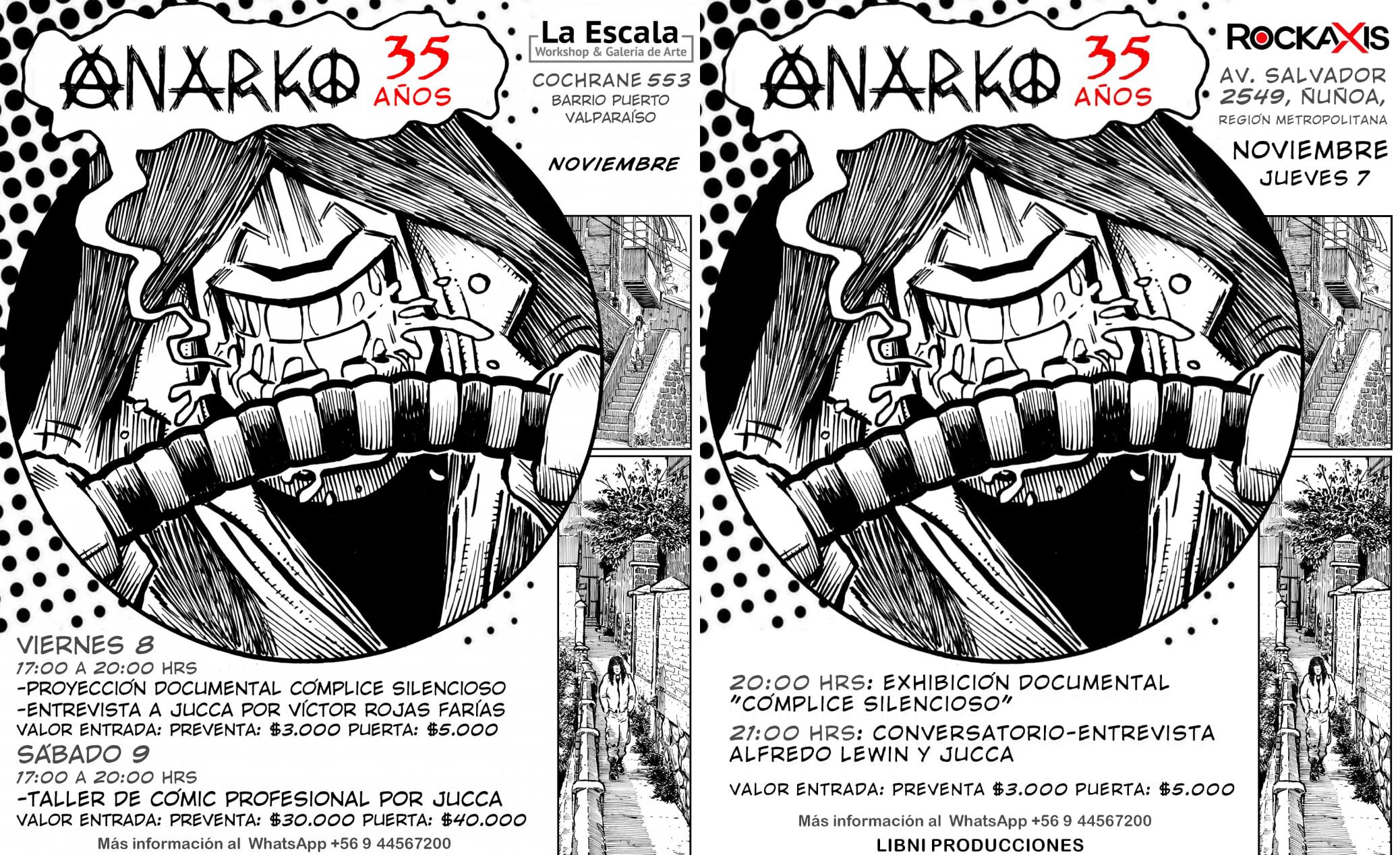 El cómic nacional "Anarko" cumple 35 años este 2024 y para conmemorar el hito se realizarán actividades en Valparaíso y Santiago, en las que se exhibirá el documental "Cómplice Silencioso" y luego habrá un conversatorio con el creador del personaje, Juan Carlos "Jucca" Cabezas.