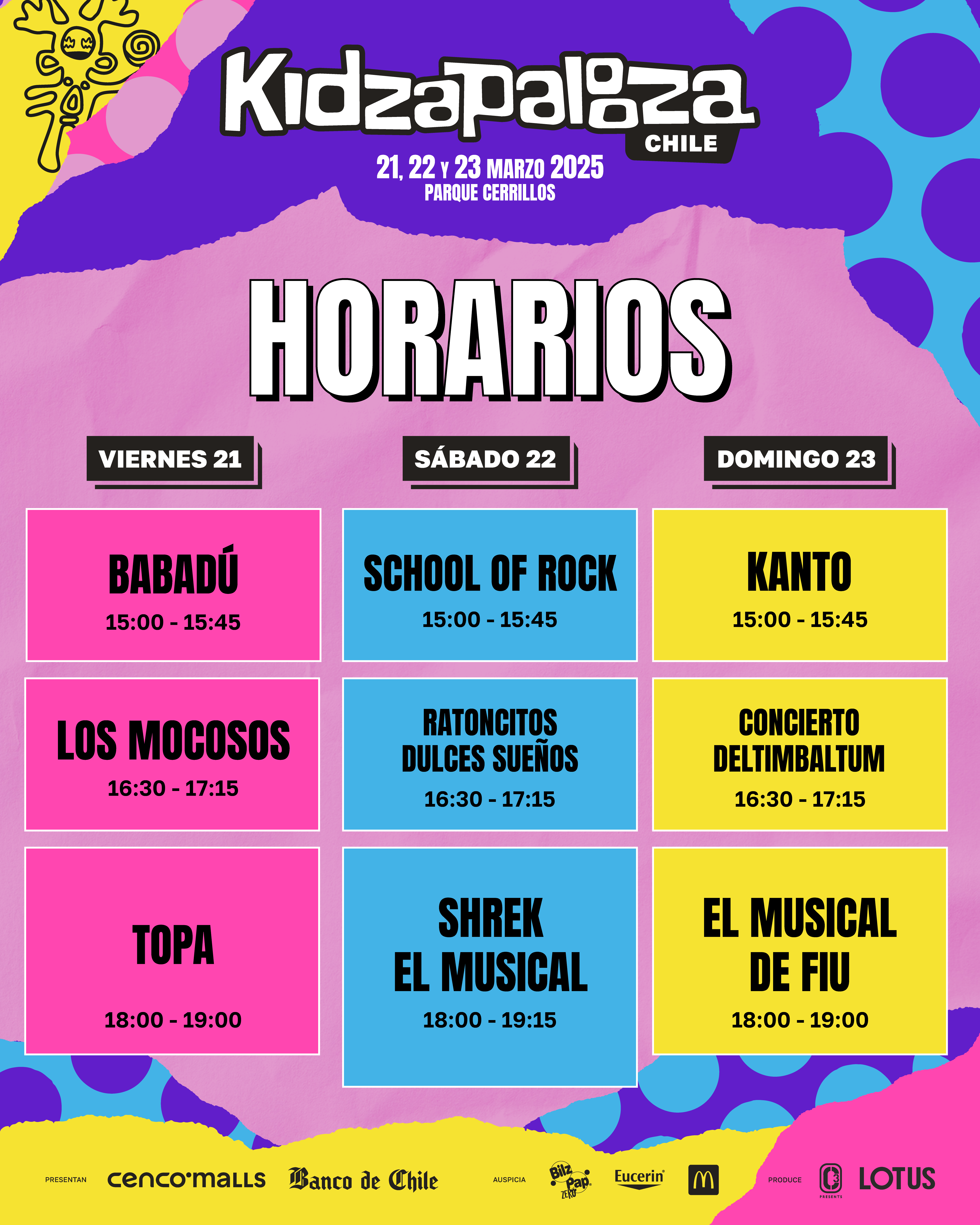 Kidzapalooza, el espacio familiar dentro de Lollapalooza Chile, se realizará los días 21, 22 y 23 de marzo en el Parque Cerrillos, de 13:00 a 19:30 hrs. La entrada es gratuita para niños de hasta 10 años con Carnet de Identidad, acompañados por un adulto con pulsera del festival.