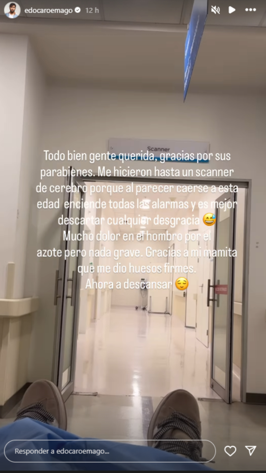 Desde la camilla, Caroe actualizó su estado de salud: "Todo bien, gente querida, gracias por sus parabienes. Me hicieron hasta un escáner de cerebro porque al parecer caerse a esta edad enciende todas las alarmas", comentó con su característico humor. Los exámenes descartaron lesiones graves.