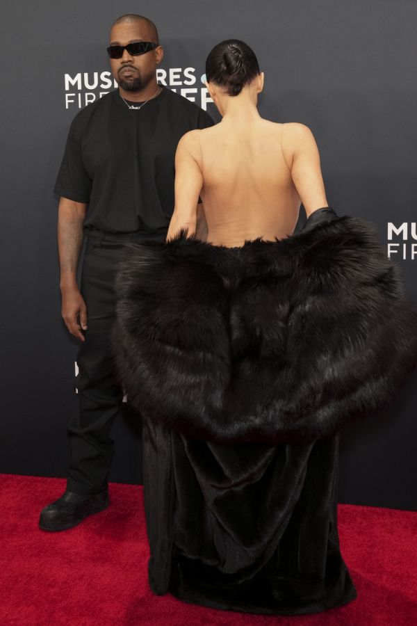 La diseñadora usaba un abrigo negro, pero en la alfombra roja, y dando la espalda a la prensa, lo dejó caer, para mostrar completamente su cuerpo, en una especie de perfomance junto a West, quien vestía completamente de negro.