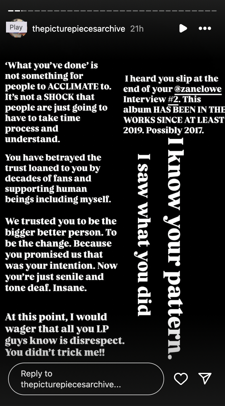 Asimismo, Jaime acusó a los intérpretes de "In the End" de no saber cómo abordar las expectativas de sus seguidores, afirmando que han "traicionado la confianza de sus fans", quienes esperaban que Shinoda fuera "mejor persona. Que serías el cambio. Porque prometiste que esa era tu intención".