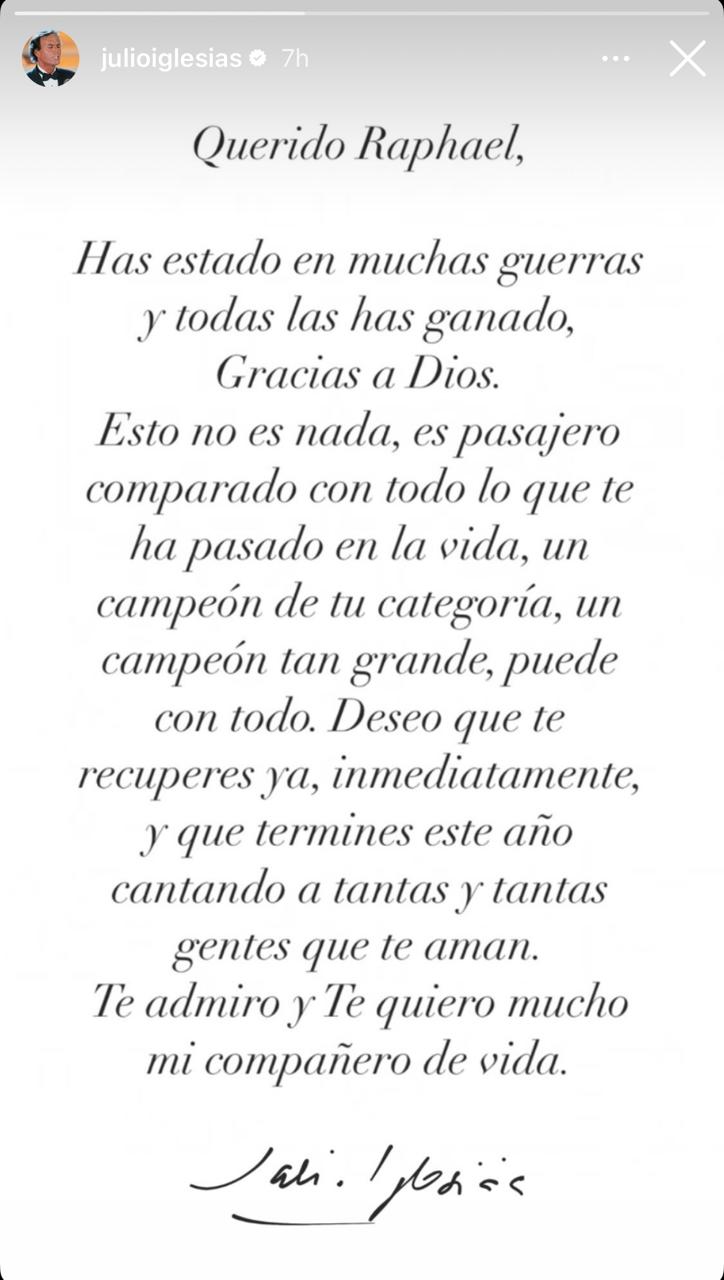 "Querido Raphael: Has estado en muchas guerras y todas las has ganado (...) Esto no es nada, es pasajero comparado con todo lo que te ha pasado en la vida", expresó Iglesias a través de su cuenta de Instagram.