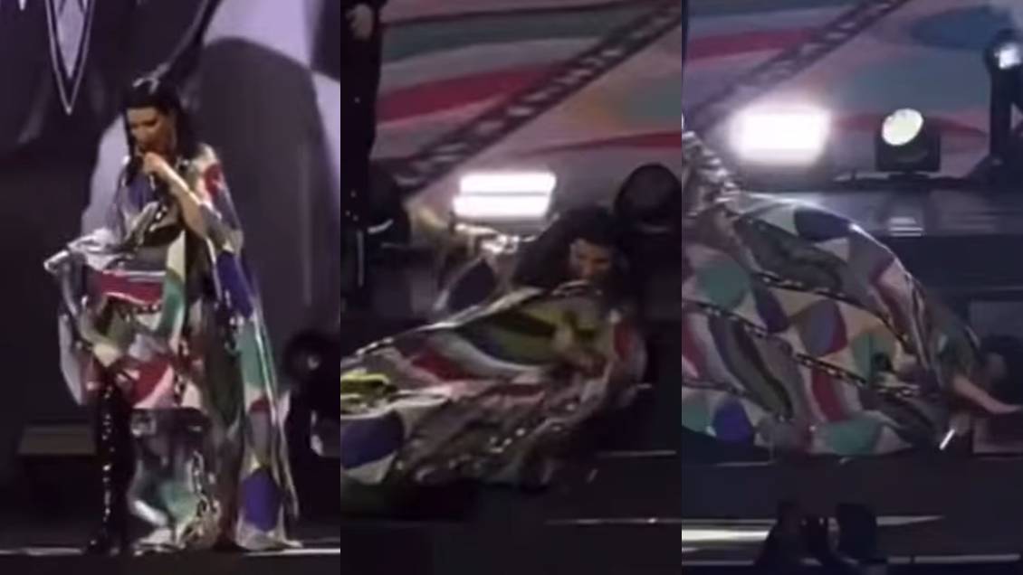 La caída, posiblemente provocada por un vestido demasiado largo o un pie mal colocado en el suelo, no arruinó la actuación de la cantante. De hecho, con el micrófono siempre en la mano, se levantó rápidamente y continuó cantando.