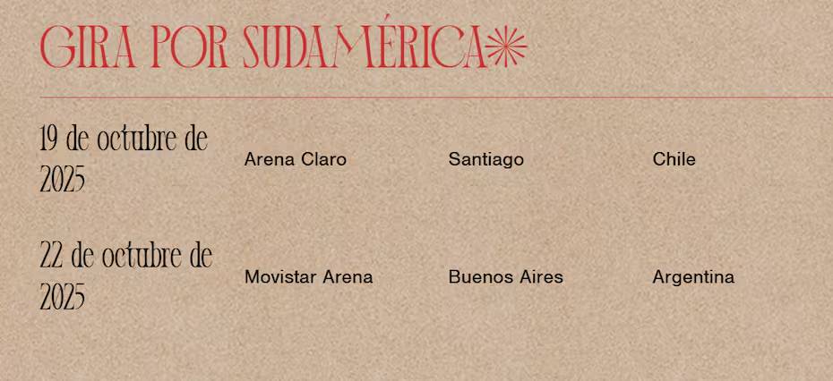 Por ahora, el único show en la región oficialmente anunciado es en Argentina, donde se presentará el 22 de octubre.