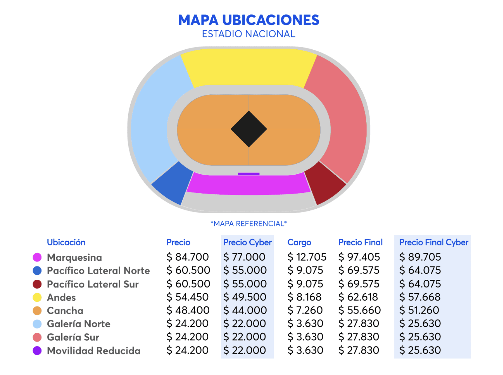 Las entradas para el festival Así Somos en el Estadio Nacional se pueden adquirir en Ticketmaster con precios que parten en los $25.630. Revisa el mapa de precios: