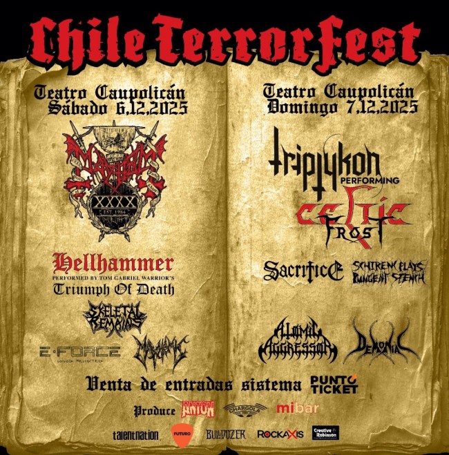 Junto a Mayhem, el cartel incluye a los suizos Triptykon y Triumph of Death, Sacrifice (Canadá), Schirenc Plays Pungent Stench (Austria), Skeletal Remains (EE.UU.), E-Force (Canadá) y los chilenos Atomic Aggressor, Mayhemic y Demoniac.