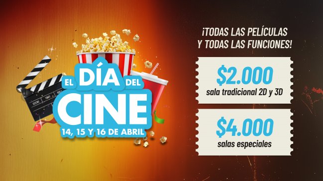 El día del Cine regresa en abril con entradas desde $2.000 en cines a nivel nacional (desde Arica hasta Punta Arenas). Esta iniciativa, que se realiza periódicamente, permite al público disfrutar de estrenos internacionales y películas en cartelera a precios reducidos en formatos como 2D, 3D y premium.