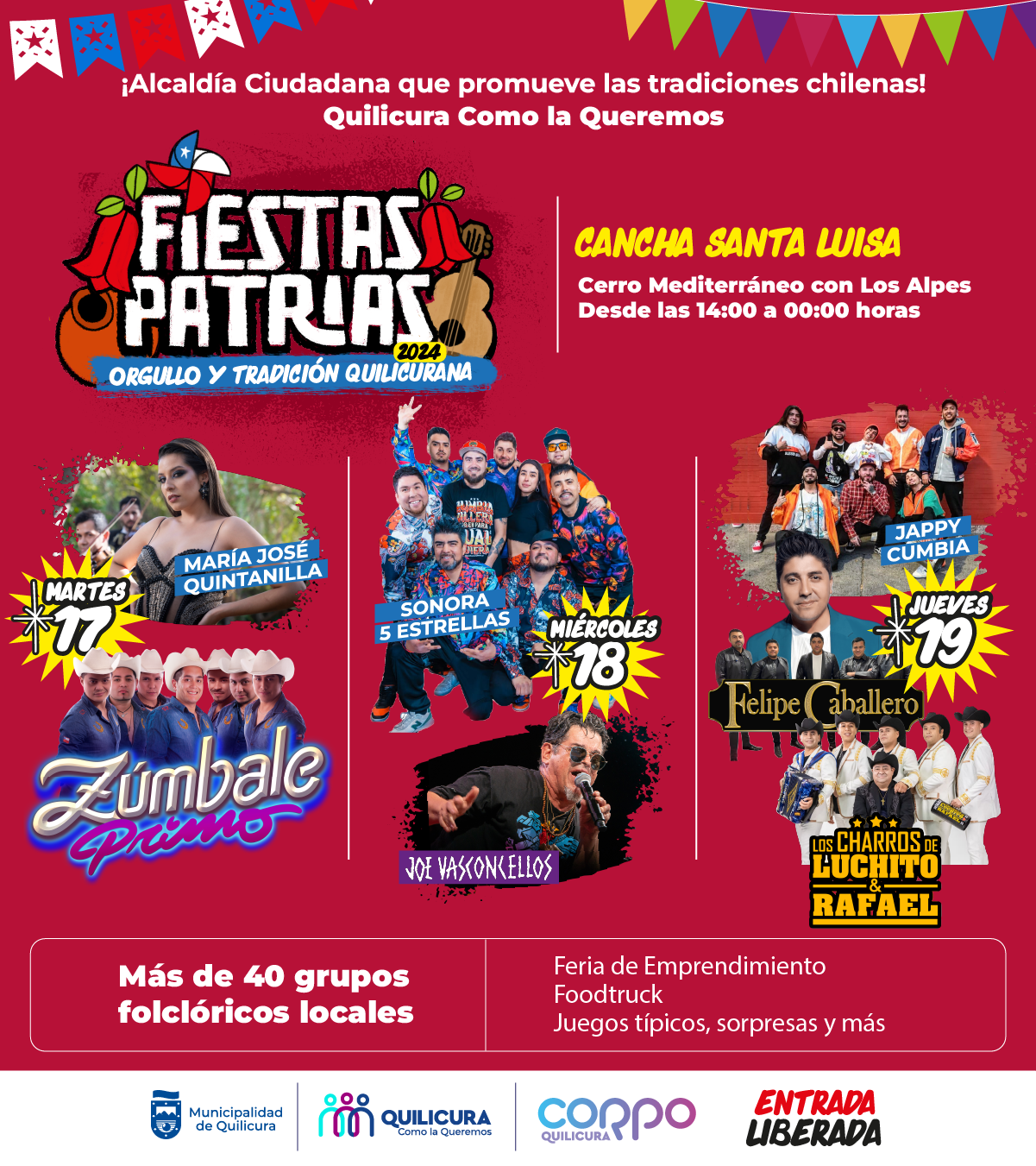 La Municipalidad de Quilicura y su Corporación Cultural celebrarán en grande las fiestas patrias con "Fiestas Patrias, Orgullo y Tradición Quilicurana", un show gratuito que contará con diversas actividades.