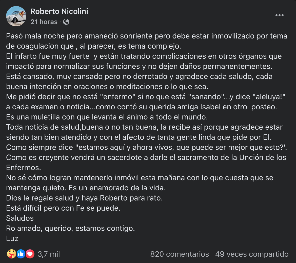 Roberto Nicolini atraviesa horas cruciales luego de sufrir un infarto el pasado domingo, que lo mantiene internado en la Unidad de Tratamientos Intensivos (UTI).