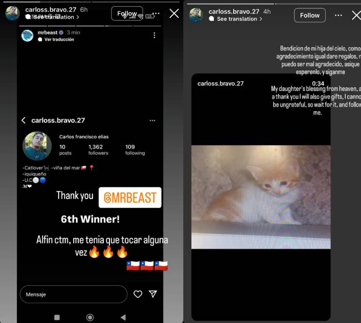 "Gracias MrBeast. Al fin, ctm, me tenía que tocar alguna vez (sic)", escribió el joven en sus historias de Instagram, asegurando que "como agradecimiento igual daré regalos, no puedo ser mal agradecido".