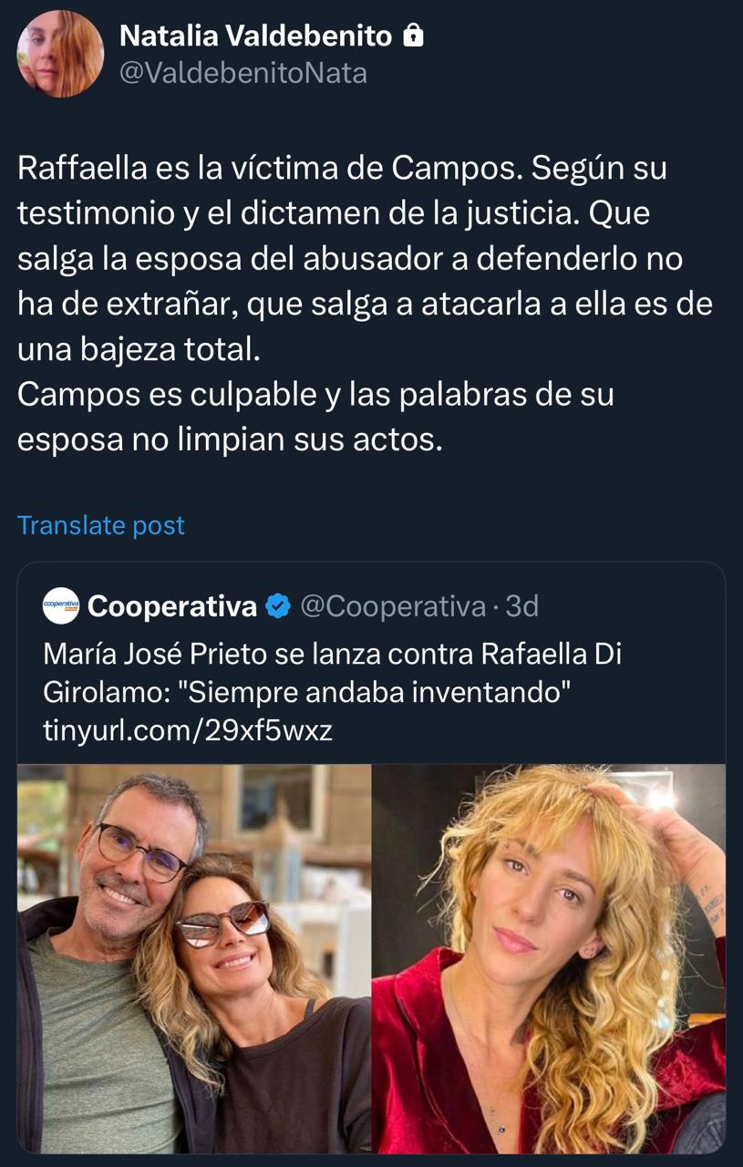A través de su cuenta de X, la también locutora radial se refirió a una entrevista que la actriz dio a El Mercurio, donde volvió a negar las acusaciones por abuso sexual contra Campos, hechas por Raffaella Di Girolamo. Asimismo, aprovechó para atacar a la psicóloga.