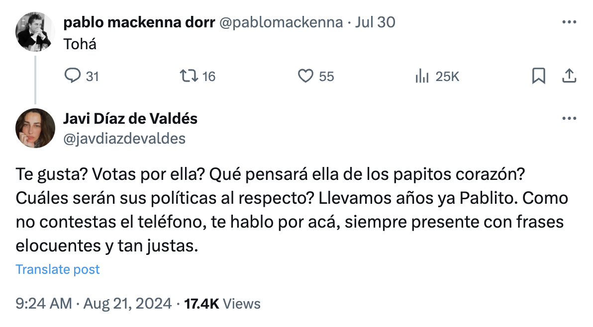 Díaz de Valdés expuso la situación a través de la red social X, plataforma donde Pablo Mackenna tiene actividad constante: en respuesta a un tuit en el que mencionaba a la actual Ministra del Interior, Carolina Tohá, la intérprete decidió encararlo.