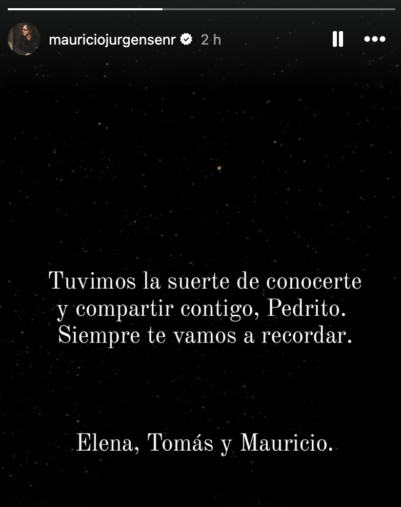 "Tuvimos la suerte de conocerte y compartir contigo, Pedrito. Siempre te vamos a recordar. Elena, Tomás y Mauricio", expresó el periodista en su cuenta de Instagram.