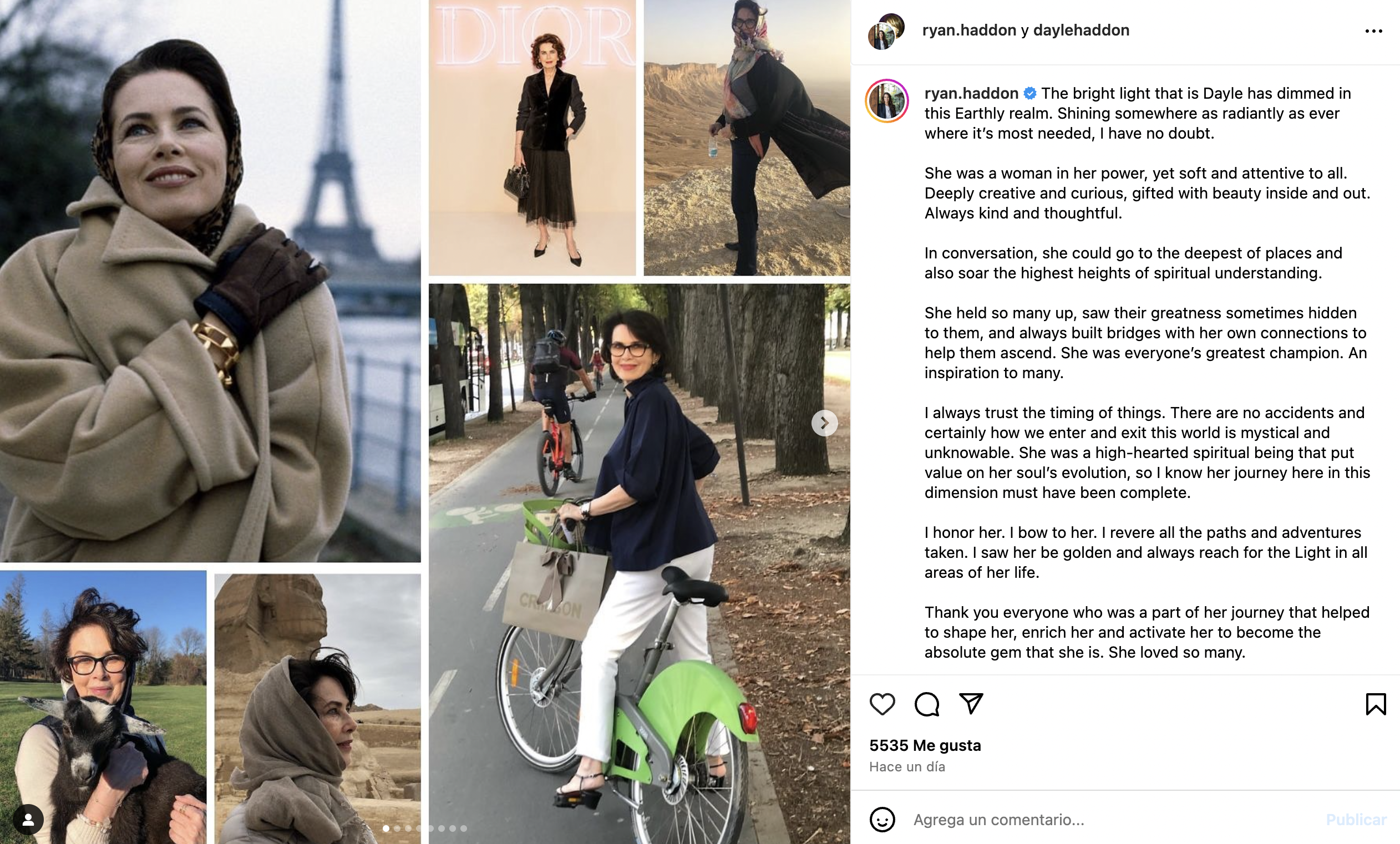 Ryan Haddon, la hija de la modelo nacida en Montreal, recordó en su perfil de Instagram a su madre como "una mujer empoderada, pero suave y atenta a todo. Profundamente creativa y curiosa, dotada de belleza por dentro y por fuera. Siempre amable y considerada".