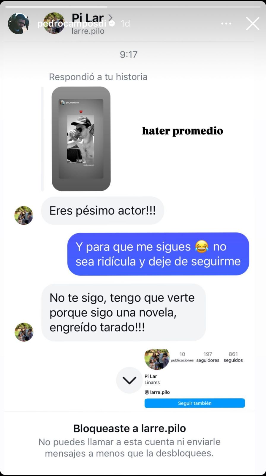Pedro Campos expuso en redes a seguidora que lo trató de "pésimo actor"