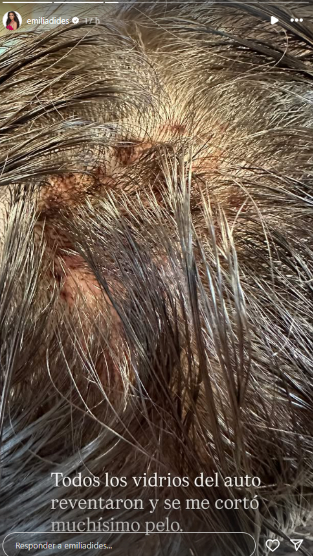 "Todos los vidrios del auto reventaron y se me cortó muchísimo pelo", escribió en una foto donde mostraba las heridas de su cabeza en ese momento.