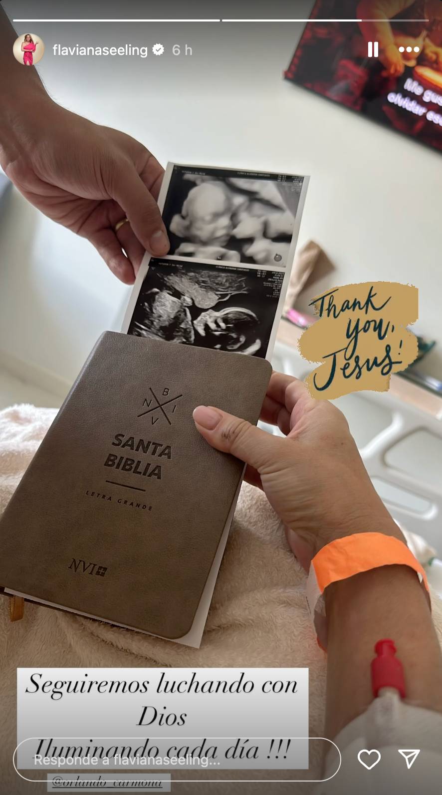 A través de Instagram, la brasileña de 47 años, que fue hospitalizada este lunes, publicó una fotografía desde la clínica, donde sostiene una biblia junto a una ecografía. "Seguimos luchando con Dios. ¡Iluminando cada día!", escribió en la imagen.