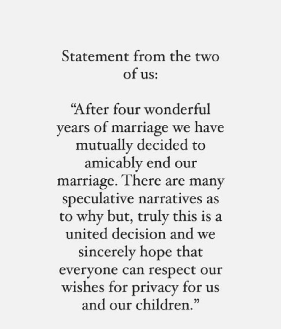 La pareja se refirió por primera vez a su quiebre a través de un comunicado en el que indicaron que "hemos decidido amigablemente poner fin a nuestro matrimonio".