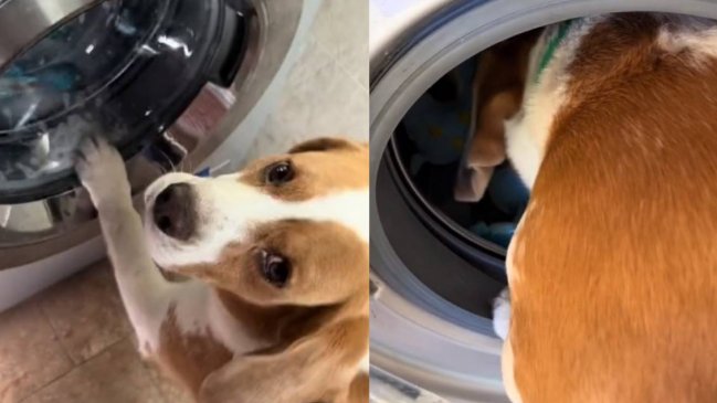 "Tengo que lavar los nenes, cuando se terminan de bañar yo te los doy", le dijo la dueña al can mientras este golpeaba la máquina para poder sacarlos o subía en dos patas para poder apretar los botones.