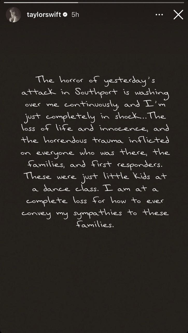 "El horror del ataque de ayer en Southport me invade continuamente. Estoy completamente en shock... La pérdida de vidas e inocencia, y el horrendo trauma infligido a todos los que estaban allí, las familias y los socorristas", escribió la artista en un comunicado, difundido en sus redes sociales.