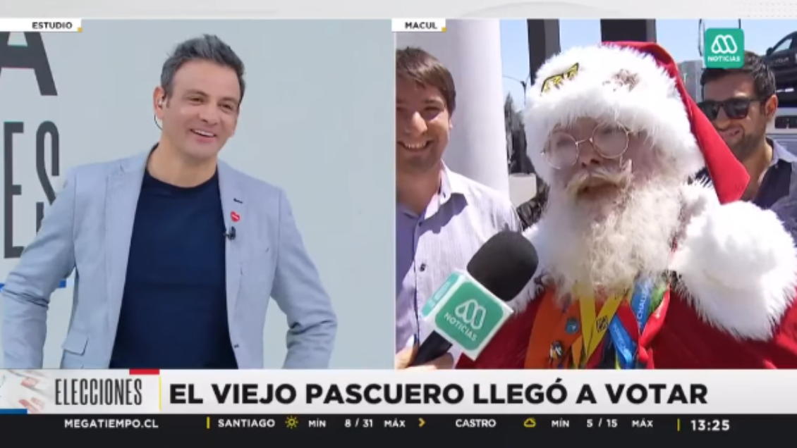 Un divertido momento presenciaron los periodistas de Mega desde el estudio al tomar contacto con un sufragante disfrazado del "Viejito Pascuero", quien se tomó el tiempo de lazarle una broma al meteorólogo Jaime Leyton.