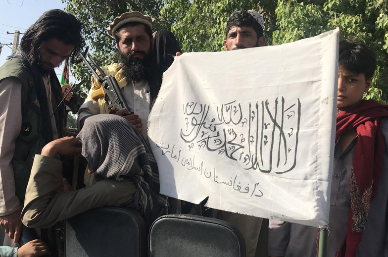 Los talibanes reaccionaron "disparando al aire" y golpeando a algunos de los presentes, entre ellos a periodistas, mientras pedían que la substituyesen por la bandera blanca inscrita con la declaración de fe islámica, que representa su Emirato Islámico.