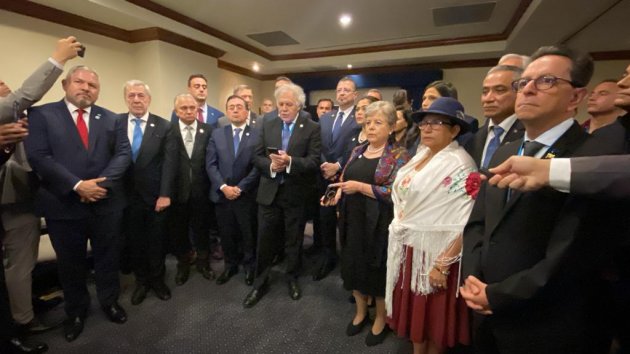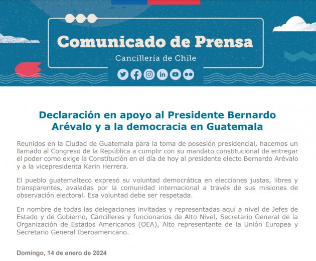 | Secretario general OEA, Luis Almagro: "Reunidos en la Ciudad de Guatemala para la toma de posesión presidencial, hacemos un llamado al Congreso de la República a cumplir con su mandato constitucional de entregar el poder, como exige la Constitución, hoy al presidente electo Bernardo Arévalo y a la vicepresidenta electa Karin Herrera"